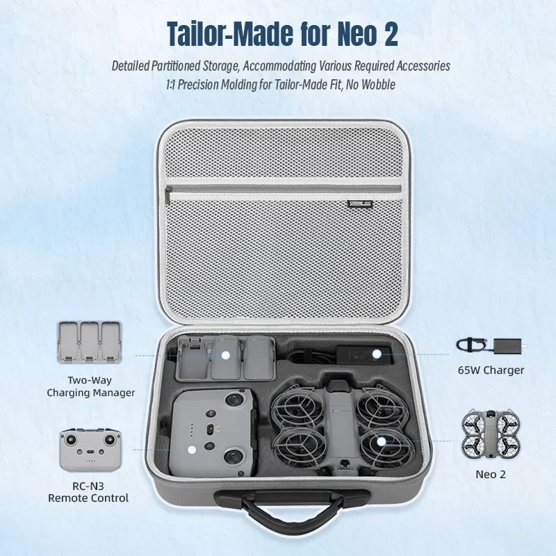 This custom-designed hard shell carrying case offers a precise, secure fit for your DJI NEO 2 aircraft, the RC-N3 Remote Controller (compatible with RC-N series), the original battery charging hub, and the 65W charging head. Keep all essential components organized and safe in one dedicated travel solution.